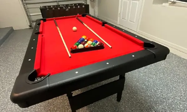 The garage comes equipped with a pool table, foosball table, and dart board for an evening of fun.