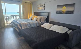 SEAZ THE DAYZ! POOL DECK AND BEACH ACCESS OPEN! This oceanfront studio offers 1 King bed and Queen pullout couch. Sleeps 4-5. Fireplace for warmth or ambiance and fully functional kitchen! Cold AC, ceiling fan and box fan for those hot Florida days! Adult pool and kiddie pool! Walking distance to the boardwalk, shopping, restaurants, bars, etc. At the corner of Int'l Speedway and A1A for you Nascar Enthusiasts! There are kid innertubes and sand toys for their enjoyment. We would be honored to host your next vacation and be part of your memories being made!