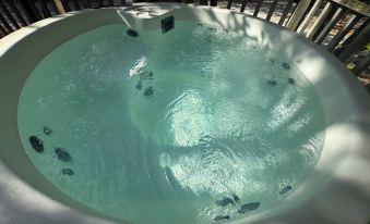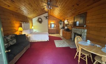 This fantastic property offers a Studio style Log Cabin with a wood burning fire place, king or queen sized bed, sleeper sofa, TV, full bathroom, kitchenette, dinette table and chairs. Enjoy modern amenities like WiFi, Roku, AC, and heating. Outside on the deck you can enjoy the peaceful surroundings with your own Hot Tub, grill and outdoor table and chairs.