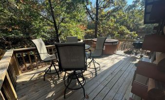 This fantastic property offers a Studio style Log Cabin with a wood burning fire place, king or queen sized bed, sleeper sofa, TV, full bathroom, kitchenette, dinette table and chairs. Enjoy modern amenities like WiFi, Roku, AC, and heating. Outside on the deck you can enjoy the peaceful surroundings with your own Hot Tub, grill and outdoor table and chairs.