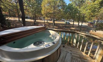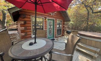 This fantastic property offers a Studio style Log Cabin with a wood burning fire place, king or queen sized bed, sleeper sofa, TV, full bathroom, kitchenette, dinette table and chairs. Enjoy modern amenities like WiFi, Roku, AC, and heating. Outside on the deck you can enjoy the peaceful surroundings with your own Hot Tub, grill and outdoor table and chairs.