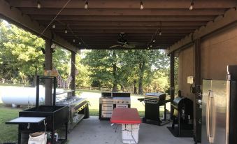 There is plenty of yard for Corn hole, bad mitten, waffle ball, etc. The outdoor kitchen is equipped with grill, commercial griddle, 2 smokers, charcoal grill counter, ice box, table, etc. charcoal, propane, and pellets provided. We have a new fire pit for seating and making s’mores. A new Hot stub is outside the master with a small seating area with propane fire top..