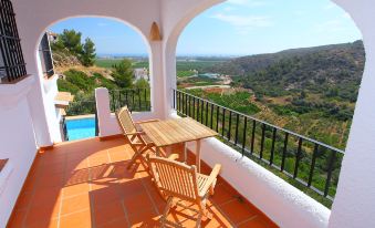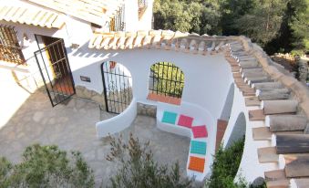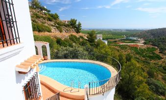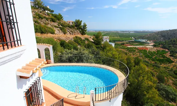 Beautiful, comfortable house "Del Azahar". In the district of Monte Pego, in a quiet, sunny, elevated position, 8 km from the sea. Private: natural state property 800 m2, swimming pool kidney shaped (4 x 8 m, depth 90 - 160 cm, seasonal availability: 01.Jan. - 31.Dec.). Shop 5 km, supermarket 5 km, shopping centre 12 km, restaurant 300 m, bus stop 7.4 km, sandy beach 8 km. Golf course (18 hole) 12 km, tennis 500 m. The owner does not accept any youth groups. 3-room house on the upper ground floor. Comfortable and beautiful furnishings: large living/dining room with open-hearth fireplace and satellite TV (flat screen), hi-fi system, DVD, air conditioning and forced-air heating. Exit to the terrace, to the swimming pool. 1 double bedroom with 2 beds (90 cm, length 190 cm). 1 room with 1 french bed (150 cm, length 190 cm), air conditioning and forced-air heating. Open kitchen (oven, microwave, freezer). Bath/shower. Terrace partly roofed. Terrace furniture, barbecue, deck chairs. Very beautiful panoramic view of the sea, the mountains, the valley and the countryside. Facilities: washing machine. Internet (WiFi, free). Parking at the house. Please note: non-smoking house. Maximum 1 pet/ dog allowed. TV only DE. AT-439162-A