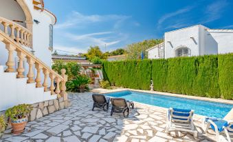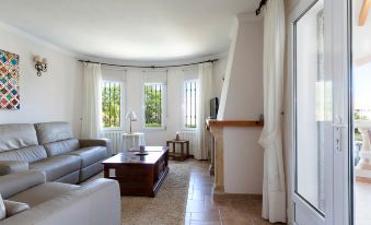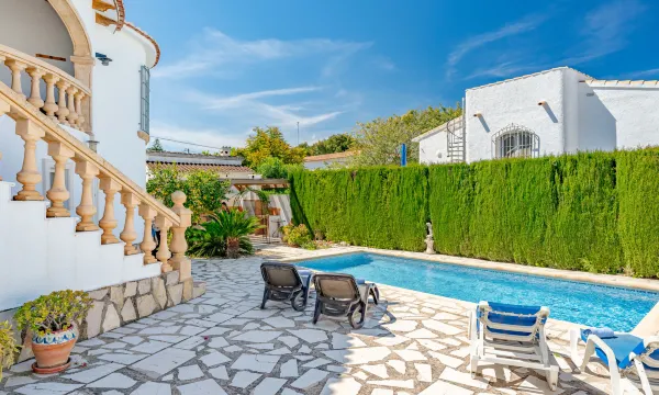 Cosy, very comfortable villa "Tulipanes". In the resort 500 m from the centre of de Dënia, in a quiet, sunny position residential area (villas). Private: beautiful, well-kept garden (fenced) with flowers and trees, swimming pool angular (4 x 8 m, depth 180 cm, seasonal availability: 01.Jan. - 31.Dec.). Outdoor shower, arbour, garden furniture, pool maintenance by the owner/gardener. Stepped path (13 steps) to the house. Parking on the premises, single garage. Supermarket, shopping centre, restaurant, bar 300 m, bus stop 1.8 km, railway station 1.8 km, ferry 3.6 km. Sports harbour 800 m, surf school, sailing school. The owner does not accept any youth groups. "Tulipanes", 4-room villa 160 m2 on 2 levels. Very comfortable and cosy furnishings: living/dining room with open-hearth fireplace, digital TV, international TV channels, gas heating and air conditioning. 1 room with 2 beds (90 cm, length 200 cm), gas heating and air conditioning. 1 room with 1 french bed and bath/bidet/WC (private) gas heating and air conditioning. Kitchen (oven, dishwasher, 4 ceramic glass hob hotplates, microwave, freezer, electric coffee machine) with bar. Shower/WC. On the lower ground floor: 1 room with 1 french bed, air conditioning and forced-air heating. Exit to the garden, to the swimming pool. Kitchenette (microwave). Shower/WC. Small balcony 9 m2, large terrace 45 m2, 2 small terraces 9 m2, garden 450 m2. Barbecue. Facilities: washing machine, dryer, children's high chair, baby cot. Internet (WiFi, free). Garage. No internal connecting door between the floors. AT-445567-A