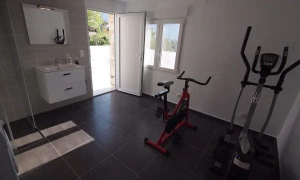 The house features a guest toilet with shower as well as a large bathroom with another shower. The lower level also includes a fitness and laundry room with a third shower.