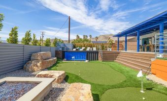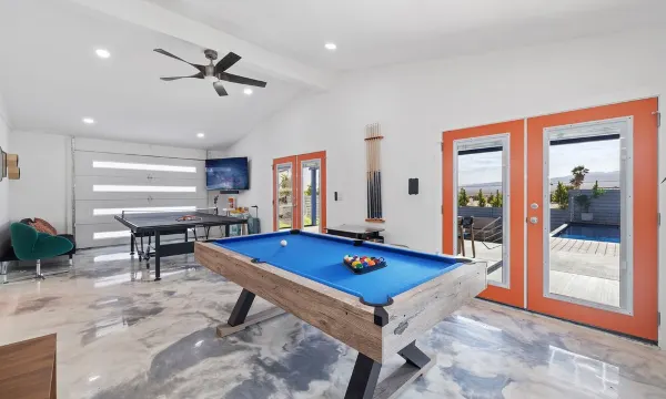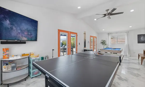 Casa Cosmos includes a custom Modpool with built-in hot tub, free pool heating, picturesque aquarium pool window, 3-hole mini golf, bocce ball, fire pit, fire place, giant desert rocks, ping pong, pool table, 412 arcade game table, Nintendo Switch! Roku TV's everywhere, patio misters, gas BBQ, fully equipped kitchen, and more!