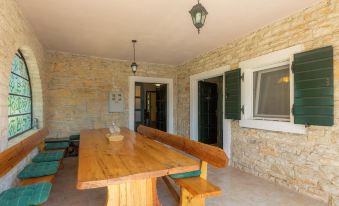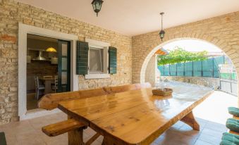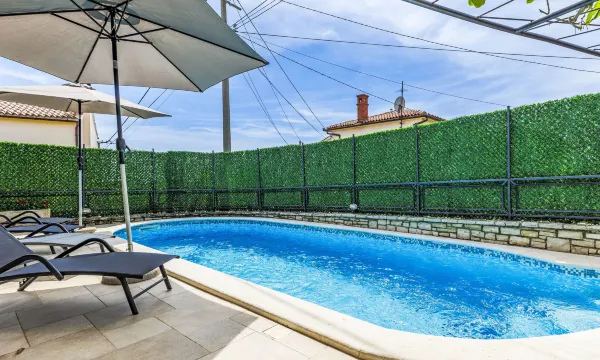 Single-family house "Villa Lancin", 2 storeys. 100 m from the centre of Divšići, 4 km from the centre of Marčana, 10 km from the centre of Vodnjan, 13 km from the sea. Private: property 120 m2 (fenced), swimming pool (25 m2, depth 130 cm, seasonal availability: 01.May. - 06.Nov.) with internal staircase. Unconventional pool shape. WC in the pool area, outdoor shower, terrace, barbecue. In the house: internet access, washing machine. Parking (for 2 cars) on the premises. Shop 4 km, restaurant 4 km, bus stop 3.5 km, pebble beach 13 km. 5-room house 200 m2 on 2 levels. Living room with open-hearth fireplace (only for decoration), air conditioning. Exit to the terrace. 1 room with 2 beds and satellite TV (flat screen). Dining room. Open kitchen (1 hot plate, oven, dishwasher, 3 gas rings, toaster, kettle, microwave, freezer, electric coffee machine). Shower/WC. Upper floor: entrance hall. Exit to the terrace. 1 room with sloping ceilings with 1 double bed and satellite TV (flat screen), air conditioning. 1 room with sloping ceilings with 1 double bed, shower/WC and satellite TV (flat screen), air conditioning. 1 room with sloping ceilings with 2 beds and satellite TV (flat screen). Bath/bidet/WC with corner bath. No heating option. 2 terraces covered. Terrace furniture, deck chairs. Facilities: iron, mosquito net, baby cot, hair dryer. Internet (WiFi, free). Please note: non-smoking house. Maximum 2 pets/ dogs allowed. When there are less than the maximum number of guests staying at the property, not all of the bedrooms will be available for use.