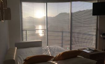 Two separate bedrooms, one with a king size bed and separate shower bathroom and the other with a large double sofa bed, and adjoining bathroom with large jacuzzi, separated by curtain from the living room. The living room also has a double sofa bed, where guests have arguably the best views in the apartment through curved, sliding floor to ceiling windows!