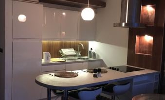 Fully equipped kitchen with breakfast bar dining arrangement and tableware sufficient for 6 people (Dining table is on the terrace) and a dishwasher.