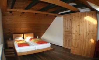 The lower apartment offers two bedrooms, one with a comfortable box spring double bed and one with two single beds and the option to add another bed.
