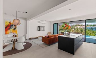 Inside the villa, the ground floor welcomes guests with a spacious living area seamlessly integrated with an open kitchen, a utility space with laundry facilities, and a dedicated workspace.