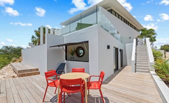 With a focus on modern aesthetics and open-plan design, the villa spans two levels, offering shaded alcoves for relaxation beside the inviting pool with loungers. The breathtaking panorama of the Caribbean Ocean invites guests to linger on the terrace or take a refreshing dip in the infinity pool.
