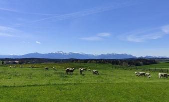 Wie hatten die FeWo ganz oben und einen wunderbaren Blick auf Felder und Berge. Es war sehr sauber und alles vorhanden, was wir brauchten. Zudem hatten wir die Möglichkeit jeden Morgen leckere Brötchen, Milch und Eier, letztere direkt vom Hof, zu bekommen. Die äußerst netten und hilfreichen Gastgeber hatten tolle Tipps für uns, was Restaurants und Ausflugstipps betraf. Die Gegend selbst ist sehr schön und ruhig, wir haben unseren Aufenthalt sehr genossen und denken heute noch gern an das allabendliche Essen auf dem Balkon, samt Blöken der Schafe und die Sonnenuntergänge dort zurück.