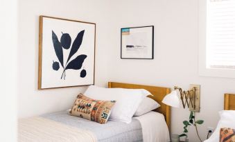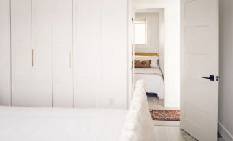 The bathroom contains a subway tiled shower, hexagon tiled floor, Carrera marble vanity, toilet, and a stacked washer and dryer. The washer and dryer are there for your convenience, so feel free to use them as needed during your stay.