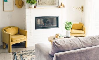 The living room has the comfiest sofa on the planet, two accent chairs, a Samsung Frame TV, and gas fireplace. There's a queen-sized air mattress in the living room closet for your convenience to act as another sleeping spot if you're in a pinch.