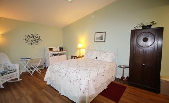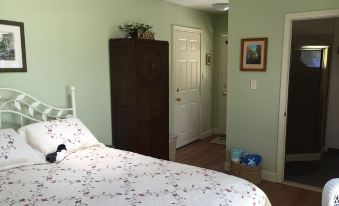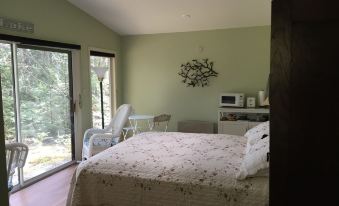 In the Loon's Nest, you'll find a comfortable queen sized bed that looks out on the lake. If you're an early riser, you can watch the sunrise from bed, but the door and windows all have blinds to lower if you plan to sleep in or nap. You're here to relax and rejuvenate! A microwave, small fridge, toaster, Keurig coffee maker, dishes and silverware are provided for light meal preparation. You have access to a gas barbecue grill as well. WiFi is provided.