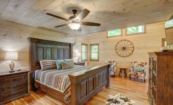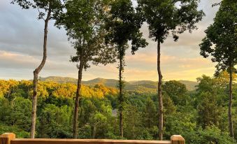 Twisted Timber Lodge is a 4-bedroom cabin with plenty of space for large families and friends. Spacious wrap around porch with stunning views of the mountains, covered deck with wood burning fireplace, smart tv, and comfy furniture, fire pit, hot tub, porch swing, grill are just some of the ways to enjoy yourselves outdoors.