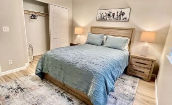 Continue off the hallway and you will find two bedrooms: the third bedroom to the right provides twin bunkbeds, a large closet, loveseat, books for kids, and games to enjoy. The fourth bedroom straight ahead is an inviting space with a queen bed, end tables, and a large closet.