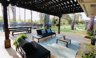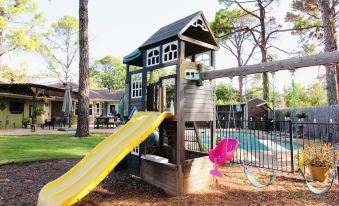 Outdoor Living spaces are very private and include a fenced pool area, a covered lounge area, hot tub, tiki bar, a fire pit with Adirondack chairs, a play house and more!