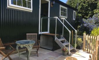 Beautiful artisan built large luxury Shepherd's Hut with patio and chiminea. Separate en suite bedroom. This stunning hut has the ambience of modern living in a quite country retreat, with wood burner. Ideal for couples. Free logs.