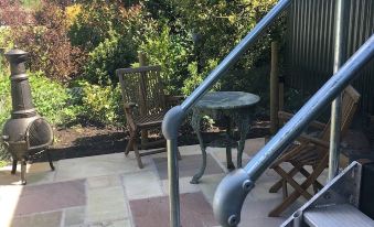 An enclosed patio area with chiminea and bbq makes a delightful setting for outdoor relaxing.
