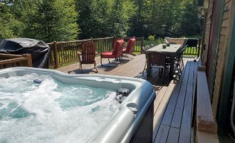 The King Master BR and guest BR (3 twins) are on 1st floor along with a fully equipped kitchen, spacious living room with large wood burning Fireplace. A Full Bath with both Jacuzzi and shower and half bath Powder/Laundry Room is also conveniently located on first floor. The fully equipped kitchen has 3 stools at the kitchen island and the dining area has 6 chairs. The large outside deck located off the Living Room has outdoor seating, a hot tub, a farm table with seating for 8 and a gas grill w/propane. There is a seasonal screened-in porch on main level for inclement weather.