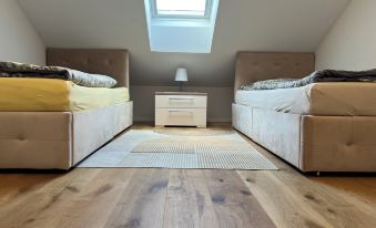 3 bedrooms: 2 single beds 1 queen bed and 1 double bed