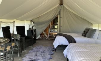 Heritage Ranch boasts 12 individually unique Glamping Tents (with showers & toilets). The Big Sky tent accommodates 2 queen size beds. Staying here you will be able to disconnect from the chaos of life being among the whispering cottonwoods and aspens with inspiring open views of the Bridger, Spanish Peaks and Tobacco Root Mountains. The fresh air, landscapes full of color, tranquility, and, of course, privacy of our property creates the perfect environment for your glamping getaway.About pets:Pets allowed: limit 2 total.About checkOut:Check out before 11:00 AM.About children:Children allowed: ages 0-17.About checkIn:Check in after 4:00 PM.About smoking:Smoking is not permitted.About events:No events allowed.