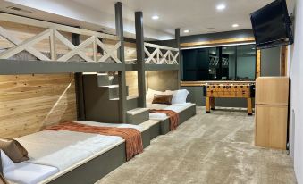 The bunk room has 2 bunk beds featuring a twin over full sized bed and is separate from the other bedrooms downstairs, perfect for a separate space for kids, or a larger family.