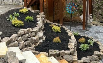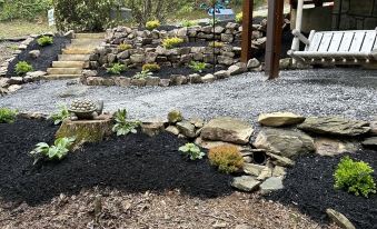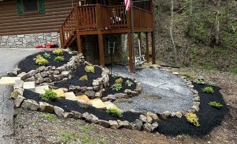 When you arrive, you will love the wide level parking. And only three steps to the covered “A” frame porch that runs the full width of cabin. Just below the deck is a small brook that produces a relaxing sound and feeds the 3 beautiful ponds just a few steps away. With all the conveniences of home, in a beautiful and peaceful location that’s just minutes from hiking, biking, skiing, golfing, go-karting, zip lining, Arts & Crafts Community and more.
