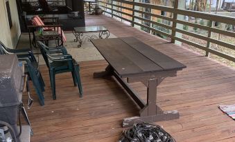 Experience a serene waterfront getaway at our Suwannee River home, complete with a private dock perfect for fishing, boating, and water activities. Take a leisurely stroll through nature or lounge on the huge deck that offers breathtaking views of the water. Gather around the cozy fire pit with family and friends for a memorable evening under the stars. The home is conveniently located on an asphalt road, so you won't have to worry about navigating through dirt roads. Additionally, you can park your vehicle under the raised house and porch, which can accommodate vehicles up to 7' high. Inside, you'll find a clean and comfortable interior with two bedrooms and a futon in the living room that can comfortably sleep up to six guests. The home is also in close proximity to several towns that offer grocery and dining options. And if you're up for exploring the area by boat, a boat ramp is just a quarter-mile away. With easy access to all the springs in the area, whether by boat or car, this waterfront retreat is the perfect spot for a relaxing vacation.About pets:No pets allowed.About checkOut:Check out before 11:00 AM.About children:Children allowed: ages 0-17.About customRules:Cleaning fee is for changeover cleaning and sanitizing. Wash your dishes. Remove food you bring to the home including he frige. Trash in receptacles.Doored closet in big bedroom is "owners" closet, please don't use or disturb that.,The Suwanne River has current and rises and lowers daily. When using canoe, please wear you PFD, not provided..About checkIn:Check in after 4:00 PM.About smoking:Smoking is not permitted.About minBookingAge:Minimum age to rent: 29.About events:No events allowed.