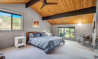 Camp Sonoma is a 4 bedroom, 2 bath home. The two upstairs bedrooms are large and include private decks, one also includes a home office (desk, chair, monitor, keyboard) and large sectional couch and TV (no cable, wifi connected for streaming services). The master bedroom has a California king with on-suite bathroom. The 2nd upstairs bedroom has a queen. The two downstairs bedrooms are smaller, both with queen mattresses. All beds are memory foam. All bedrooms have individual controlled heat and AC.