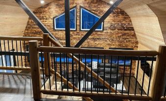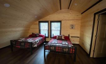 Perfect for groups, the cabin comfortably sleeps 9. The airy loft offers space for 5 with two double beds and one twin bed. The main floor features a king bedroom for 2, while the walk-out basement includes a queen bedroom for 2. Each level boasts a full bathroom with a shower for your convenience.