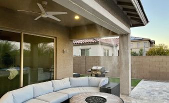 Private pool and spa, covered patio with cushioned outdoor sofa, gas fire table, gas grill, and patio misters
