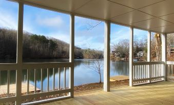 As you walk through the sliding glass doors, you have the beautiful view of Lake Santeetlah. On this screened-in porch, you can relax on the sectional sofa or have your meals at the second dining table.