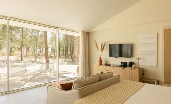 Chose Spatia after reading reviews of similar Comporta area wellness resorts and not for one moment did we regret our choice. The resort is sensitively designed and almost hidden amongst tall pines and eucalyptus trees. A feeling of peace and serenity abounds as you allow nature to embrace you. Our room was spacious, cool and exquisitely designed with a terrace open to the surrounding woodland: a hammock was hung across the patio. Complimentary wine, pastries and fridge contents provided a welcoming touch. The public areas are designed in the same cool understated way with the accent on relaxation and comfort. Two pool areas are havens of peace; low shrubs and fine grasses fringing these areas wave enticingly in the breeze. Your breakfast buffet is laid out beautifully and -although the food isn’t Spatias strongest quality- there is a kitchen open throughout the afternoon and evening providing decent fare. Buggies or bicycles are available to move you around the estate and there are courts, spa and gym facilities too. Spatia Comporta is a place for de-stressing, relaxing and unwinding; it delivers in spades!