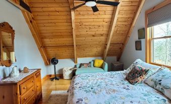 Enjoy cooking in the fully stocked kitchen, gather around the wood-burning fireplace in the main living area, or take in the fresh mountain air from the large deck that overlooks the forest and garden. The loft area provides extra lounging space or a quiet nook to relax with a book.