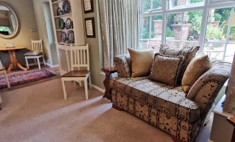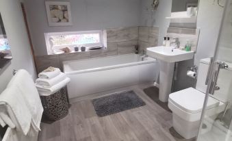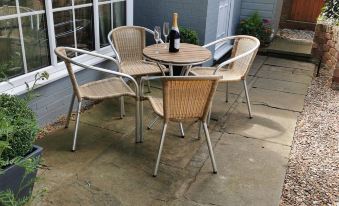 Park your car in the private, off-road space and enjoy the lovely gardens with yew hedging, weeping willow tree and ornamental borders. To the front of the cottage there's a flagstone patio, with table and chairs. The entrance door leads into an open plan dining area and fully fitted kitchen. There's a cosy lounge, with fireplace, comfortable furnishings, and large screen TV with radio and access to streaming services. Upstairs is a luxuriously furnished double bedroom with a cosy double bed, 4 seasons duvet and high thread count, white bed linen. The bedroom also enjoys garden views and has a chest of drawers, dressing table and large, built in wardrobe. The very spacious bathroom has a white suite which includes a full-size bath, wash basin, WC, and separate shower. Fluffy white towels are provided