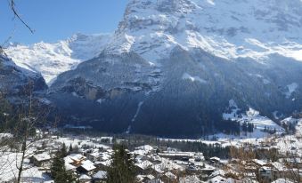 Cosy, rustic 2-family house "Chalet Colette", 2 storeys, detached, surrounded by meadows. In the district of Schybersboden, 550 m from the centre, in a quiet, sunny, elevated position on a slope, excellent location: right in the centre but still quiet, in the countryside, south facing position. For shared use: natural state property. Patio. In the house: storage room for skis, central heating system, washing machine, tumble dryer (for shared use, extra). Very steep motor access. In Winter: please take snow chains, 4x4 car recommended in winter. 50 m steep footpath to the house. Parking at 50 m. Shopping centre 550 m, restaurant 600 m, bakery 700 m, bicycle rental 1 km, 10 minute walk to the centre, bus stop "Kreuzweg Bus Nr. 122" 350 m, railway station "Grindelwald Dorf" 700 m, indoor swimming pool 300 m. Golf course (9 hole) 3.5 km, tennis 2 km, minigolf 800 m, sports centre 600 m, cable car 1 km, mountain railway 600 m, gondola lift 800 m, ski rental 300 m, ski bus stop 650 m, cross country ski track 2 km, children's playground 600 m. Well-known lakes can easily be reached: Thuner-/Brienzersee 18 km. Please note: no lift. Ski bus (free of charge). Free ski bus service to the ski region First, Männlichen/kl. Scheidegg. 3-room apartment 50 m2, on the ground floor, south facing position. Object suitable for 2 adults + 2 children. Practical and wooden furniture furnishings: living/dining room with dining nook, cable TV and flat screen. Exit to the terrace. 1 room with 2 beds (90 cm, length 200 cm). 1 small children's room with 1 x 2 bunk beds (90 cm, length 200 cm). Small kitchen (oven, dishwasher, 4 ceramic glass hob hotplates, toaster, kettle, freezer, electric coffee machine, fondue Set (chinoise, cheese)). Shower/WC. Wooden floors. Terrace, south facing position. Terrace furniture. Marvellous view of the mountains, the valley and the resort. Facilities: baby cot for up to 2 year olds (extra), hair dryer. Internet (WiFi, free). Parking (1 car) at 50 m. Please note: suitable for families. Non-smokers only. Fire extinguisher.