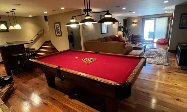 A game room complete with full bar, ice maker, refrigerator/freezer, pool table, 60” TV, sectional couch, lazy boy, Nordic Track, treadmill and rowing machine are downstairs as well as a full bedroom with Queen size bed, full bath, sitting area, 42” smart TV, separate entrance, and direct access to the outdoor Hot Tub.