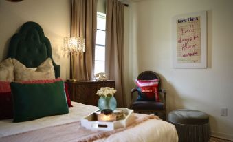 Enjoy a memorable stay at this uniquely decorated, Instagram-worthy home in historic Hico, Texas! Perfect for a girls’ getaway, family trip, or any other fun group. Put the needle on the record and relax on the yellow velvet couch in the front sitting area while listening to vinyl records or strumming the guitar.
