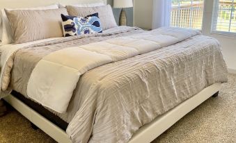 Looking to heat things up? Sit back and relax under the stars and lights by our large fire pit with several chairs and picnic table. Our back yard is very large and relatively flat perfect for all activities. We have a corn hole set as well as many other outdoor yard games.