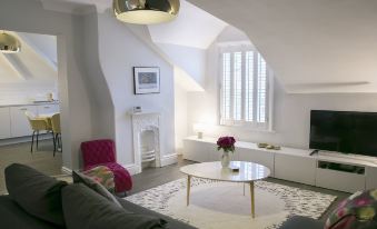 It has a spacious living room, with sofa bed and Smart TV, brand new kitchen / diner with round marble table which seats 4 people. Integrated appliances including washer dryer. Good sized bedroom with king bed and built-in wardrobe, Smart TV in bedroom. Stylish bathroom in grey marble effect tile with underfloor heating, bath with separate shower. Free WIFI. Furnished and styled to an excellent standard, offering first class contemporary accommodation in a convenient location.