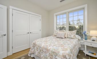 The 9 ft ceilings are so welcoming as you enter the combination dining and living area. You will find a large white washed barn board style dining room table with seating for 6. The living area invites you to relax on the oversized couch or plush chairs. Through the slider you will enter your private balcony to enjoy morning coffee and watch Harwich Port awake. Off the hallway you will find Bedroom #2 with a queen bed, dresser and large closet. Across the hall is Bathroom #1 a full bath with Carrara marbleized porcelain tile flooring and a flat front soaking tub in a wonderful nautical decor.
