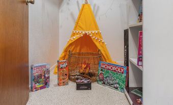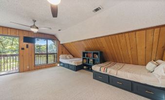 Upstairs you’ll find one king bedroom with en suite and rain shower. And an incredible, camp-themed loft with four custom-built queen beds and lots of fun details to discover! It’s the perfect kids space!