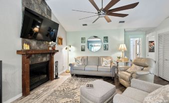 Kitchen is stocked with spices, oil, and vinegar, as well as full dinnerware and flatware sets, pans and skillets for cooking, knife set, cutting boards, and everything else you could need to prepare a delicious meal. You’ll also find a Ninja blender, full coffee station with drip pot and K-cup compatibility, pitchers for iced tea or lemonade, and a kettle for easy hot tea or cocoa before bed.