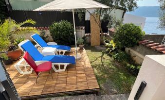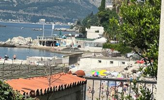 Beautiful bright 400 sf apartment in the best location of Herceg Novi (Savina ) with a private bedroom with a queen bed and a private yard with sunbeds and an umbrella! Located next to hotel Perna where there is a breakfast buffet and beautiful retsuarnt and a private beach.