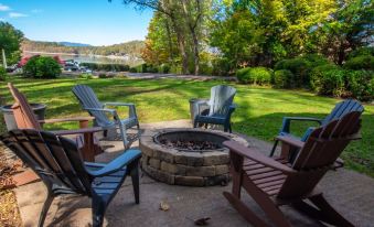 This beautiful lakefront cabin has a king size master on the main level with a half bath ensuite. The full bath is right off the kitchen. There is room for 8 at the dining table with more seating at the outdoor picnic table. Downstairs there is a queen bed and daybed with a trundle in 1 room with twin beds in the other bedroom and a full bath bath. In the morning, take your coffee out to sit in the porch swing and enjoy the view. Afternoons can be spent at the oversized cover dock with a side swimming platform. The living room has a gas fireplace to enjoy on cool nights, or you can sit outside and around the fire pit if you prefer the great outdoors.