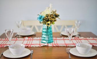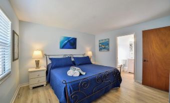 With its bright and airy layout, you enter the villa into the open concept living/dining room, which boasts a comfortable three-person couch and an armchair. The space is decorated in relaxing hues of blues, grays and whites with pops of color throughout. An HD smart television is available for your enjoyment with Wi-Fi Internet and cable included, of course!