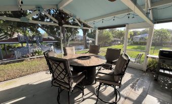 As for the screened-in lanai, it's more than just an outdoor space. This haven includes plush seating perfect for reading or sipping your morning coffee, a hot tub for ultimate relaxation, a tiki bar with outdoor fridge ready for happy hour, a Weber grill, firepit table, and an outdoor smart TV. Whether you're cooking up the day’s catch or simply unwinding after a day on the water, the lanai offers a tranquil setting for any activity.